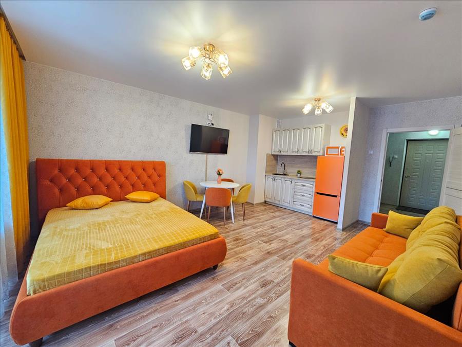 В жилой комнате два дивана (4 спальных места). Шкаф, два стола. Журнальный стеклянный столик на опорах. Горка. Зеркало.